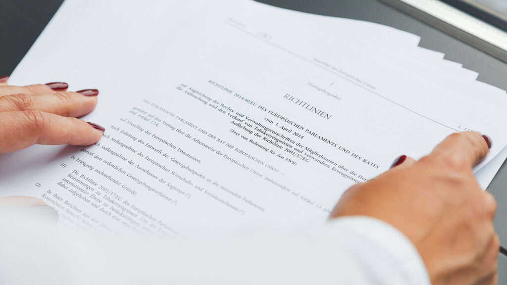 Die laufende Evaluierung der aktuellen EU-Tabakproduktrichtlinie (TPD2 – 2014 verabschiedet und seit 2016 in Kraft) durch die Europäische Kommission befasst sich mit dem Anwendungsbereich der Herstellungsvorschriften, der Aufmachung und dem Verkauf von Nikotinerzeugnissen in der EU, einschließlich herkömmlicher Zigaretten und Feinschnitttabak sowie neuer Nikotinerzeugnisse wie E-Zigaretten und Tabakerhitzer.