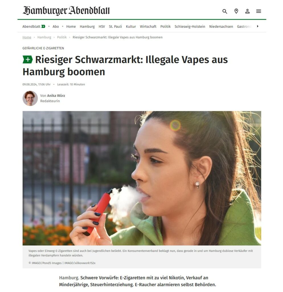 Praxisbeispiel gefällig? Die Konsumentenvereinigung Bundesverband rauchfreie Alternative e.V. (BVRA) hatte im August auf illegale E-Zigaretten in Online-Shops hingewiesen. Das Hamburger Abendblatt berichtete daraufhin unter dem Titel Riesiger Schwarzmarkt: Illegale Vapes aus Hamburg boomen (Paid Content) über alarmierende Versäumnisse der zuständigen Kontrollorgane. Steuerhinterziehung, Vertrieb von illegalen Produkten und die fehlende Altersverifikation sind dabei die Hauptkritikpunkte. Verbraucher- und Jugendschutz: Fehlanzeige.