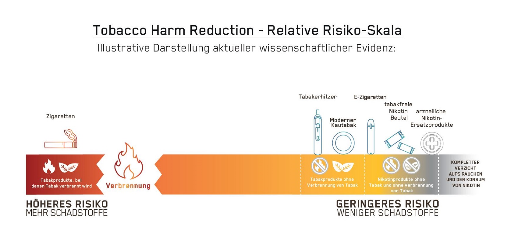 Dabei besteht das höchste gesundheitliche Risiko in der Verbrennung von Tabak und dem Einatmen des entstehenden Tabakrauches. Wird jedoch kein Tabak mehr verbrannt (Tabakerhitzer und moderner Kautabak) oder ist überhaupt kein Tabak mehr in den Produkten enthalten (E-Zigaretten und tabakfreie Nikotinbeutel), sinkt das gesundheitliche Risikopotenzial erheblich.